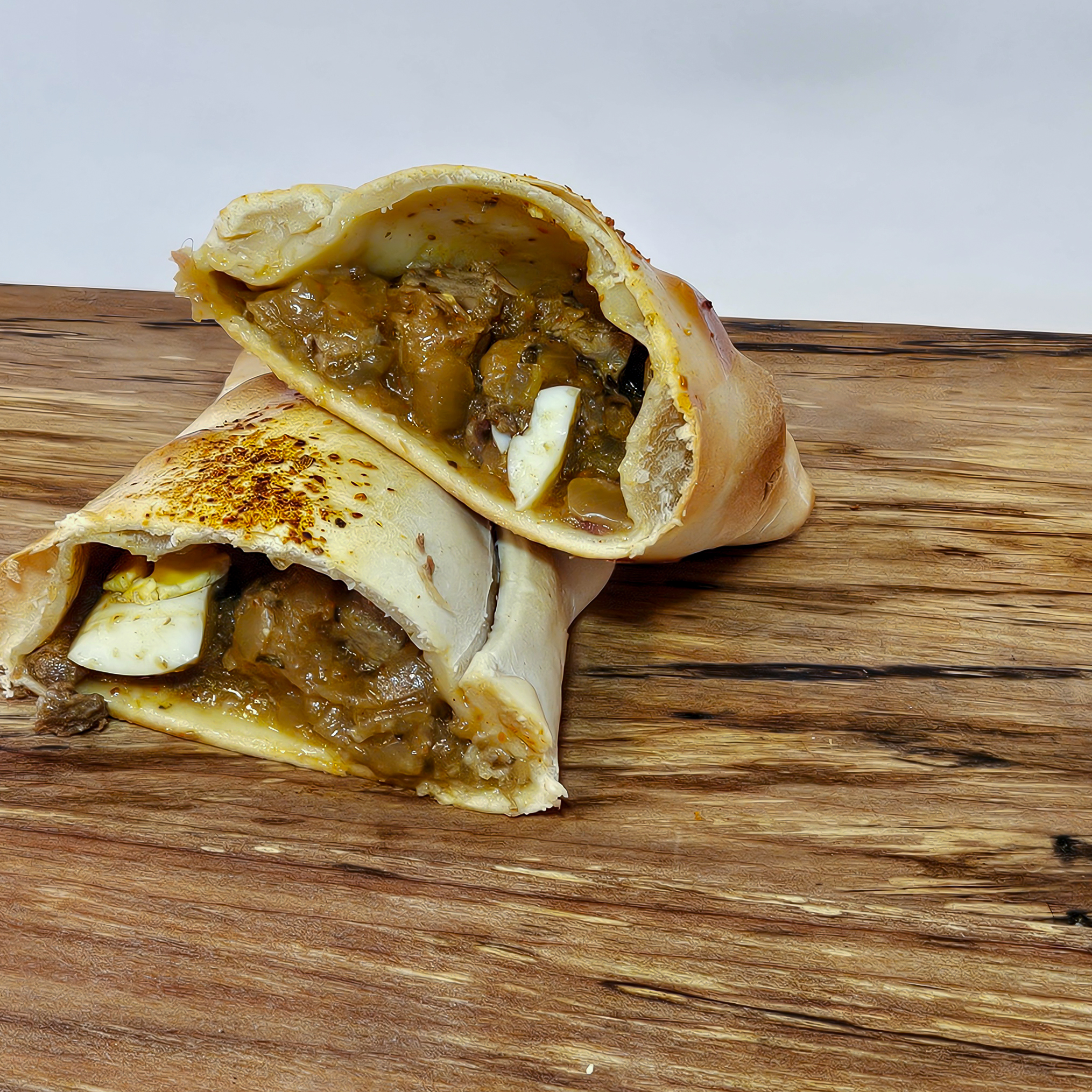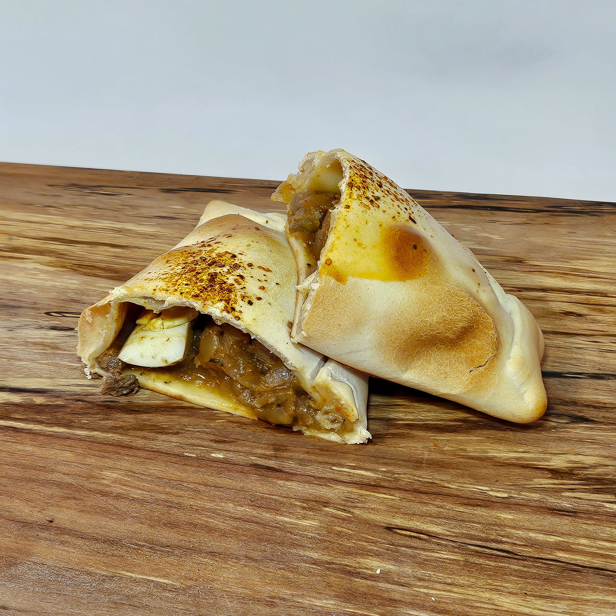 Empanada de Carne y Merkén. Jugosa carne sazonada con el picante único del merkén, en una deliciosa masa tradicional.